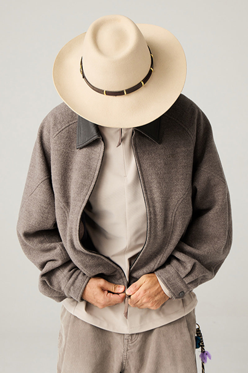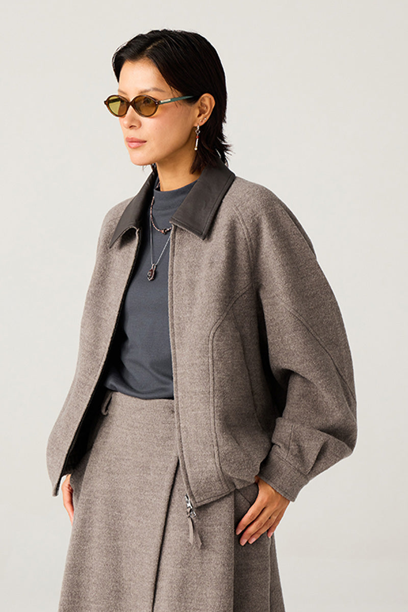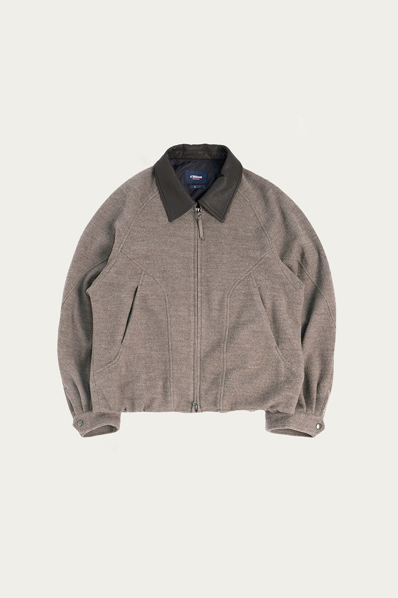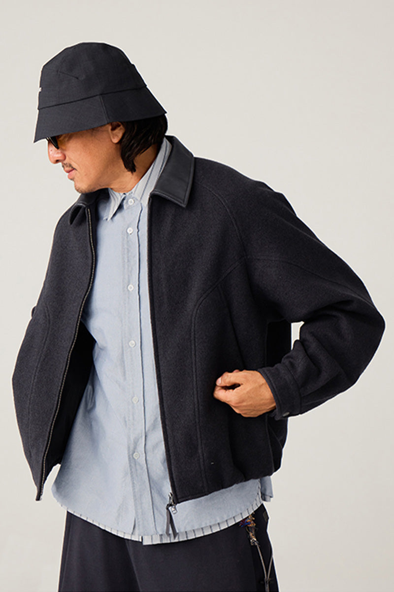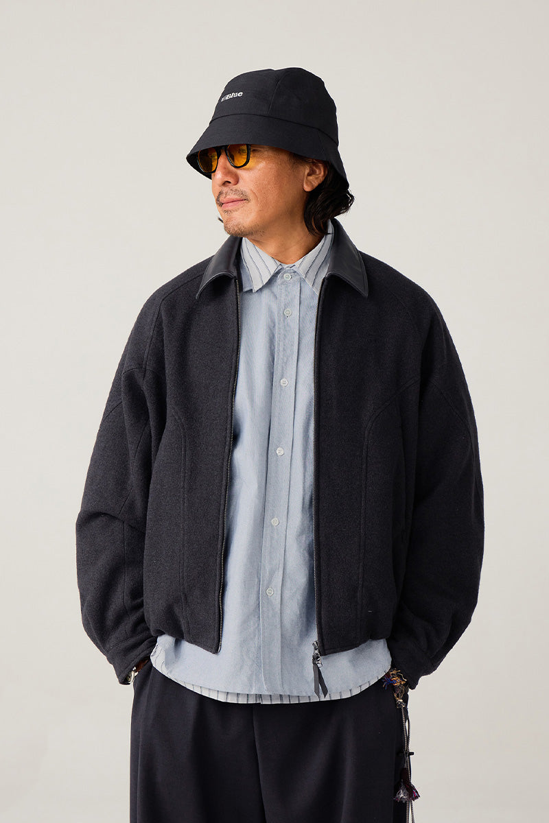異素材カラーブロックのレザーカラー:本体と対比するカラーの革調襟が、ヴィンテージ感とモダンなトレンド感を融合。クラシックでありながらも、現代的な存在感を放ちます。