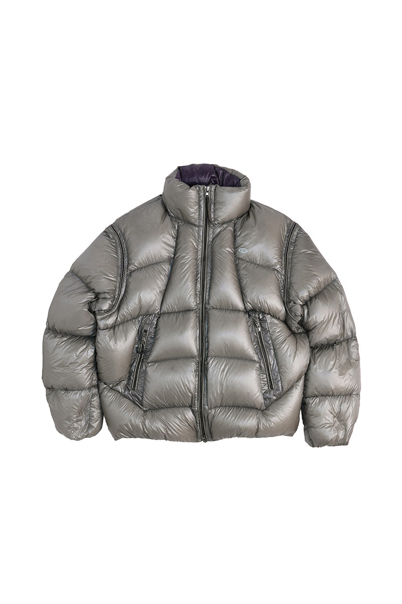 肩から袖にかけての 立体的な縫製ライン と 両側不充填設計によるツートンカラー効果 は、視覚的にボリュームを強調しつつ、スッキリとしたシルエットを演出。