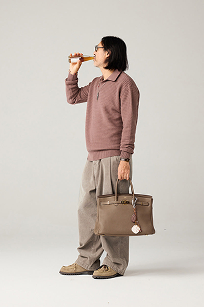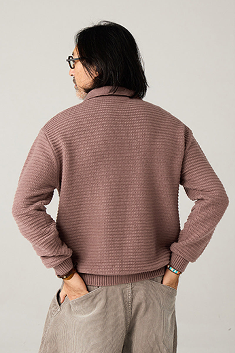 横縞の立体ジャカード編み:シンプルながらも奥行きのある質感。重厚感と落ち着きのある印象を演出し、派手すぎず、大人の風格を引き立てます。