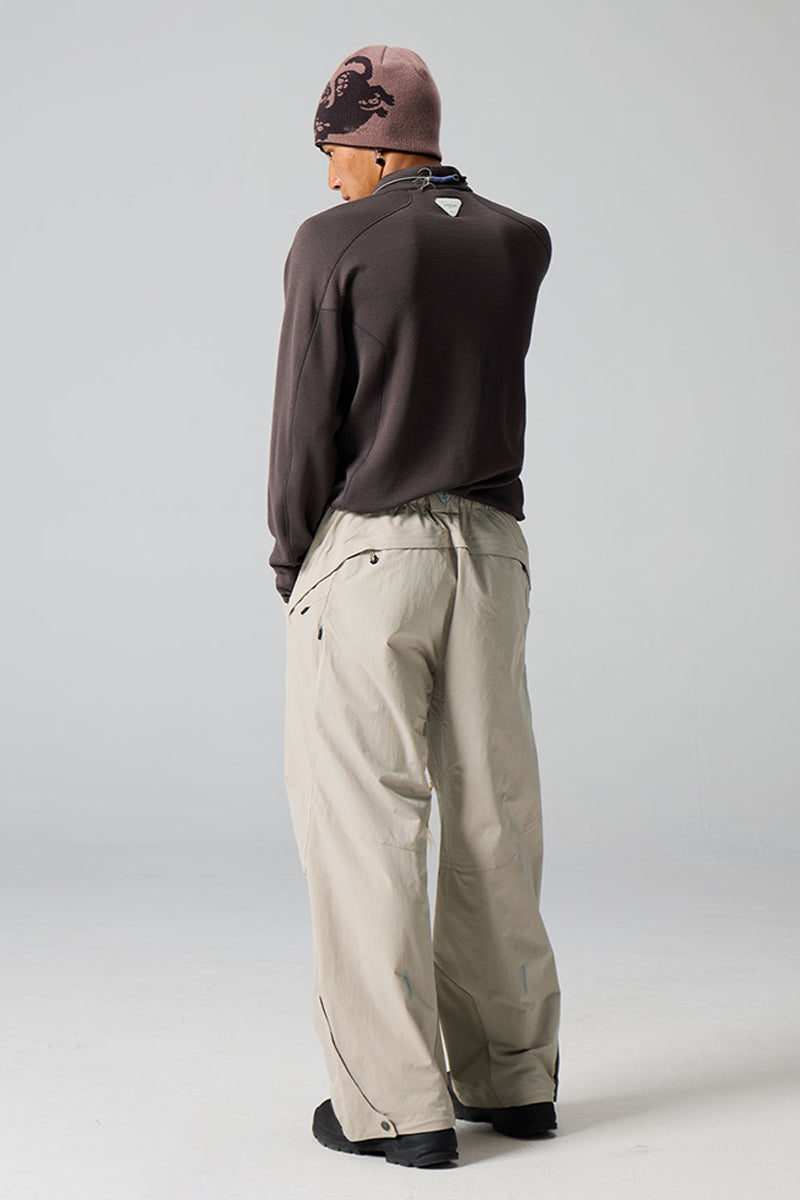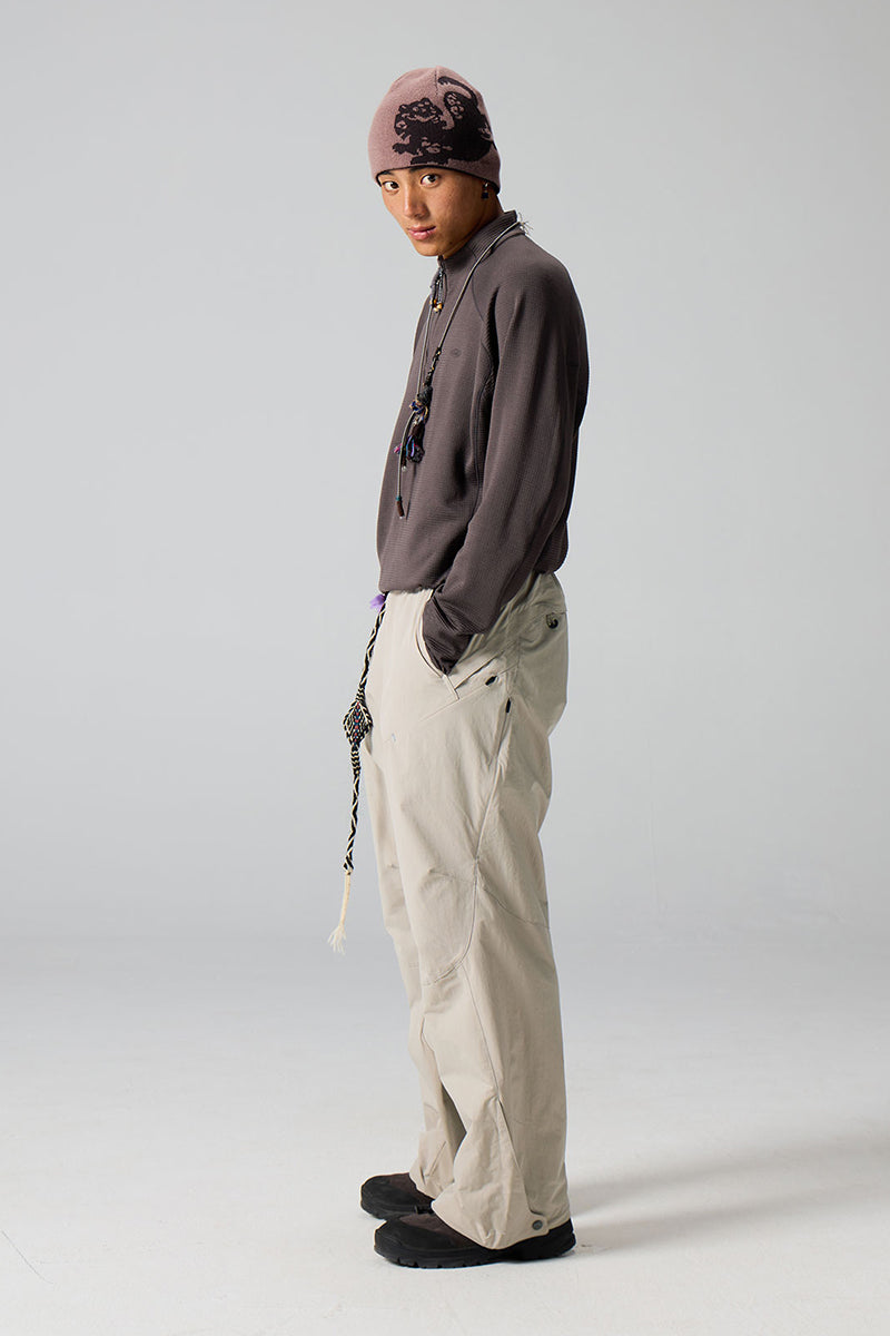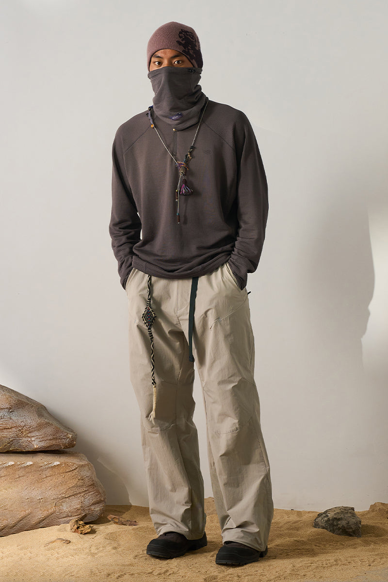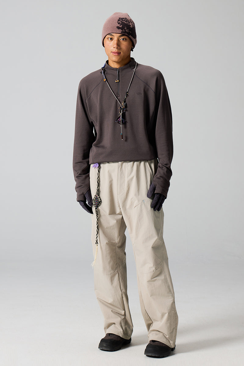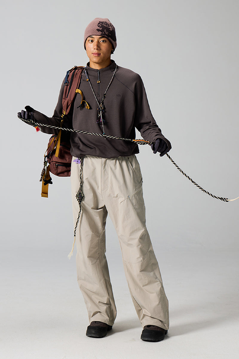 左袖にはコレクション限定の「日月共輝」ロゴ刺繍を施し、背中にはブランドのシンボルである三角形のマークを配置。このデザインは、「25AW『日月共輝、随光同行』」というテーマを強調し、独自の世界観とブランド識別度を高める重要なディテールです。