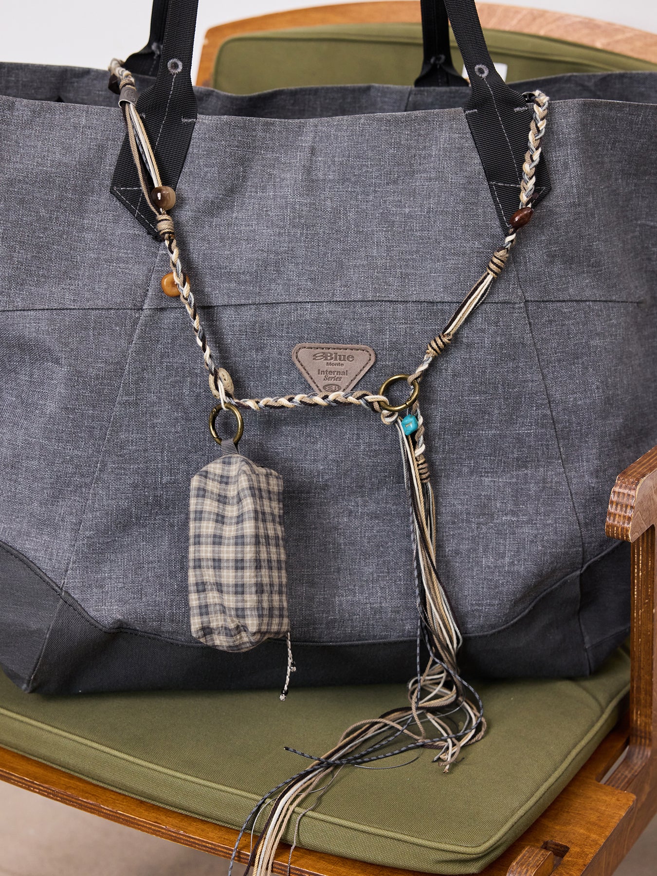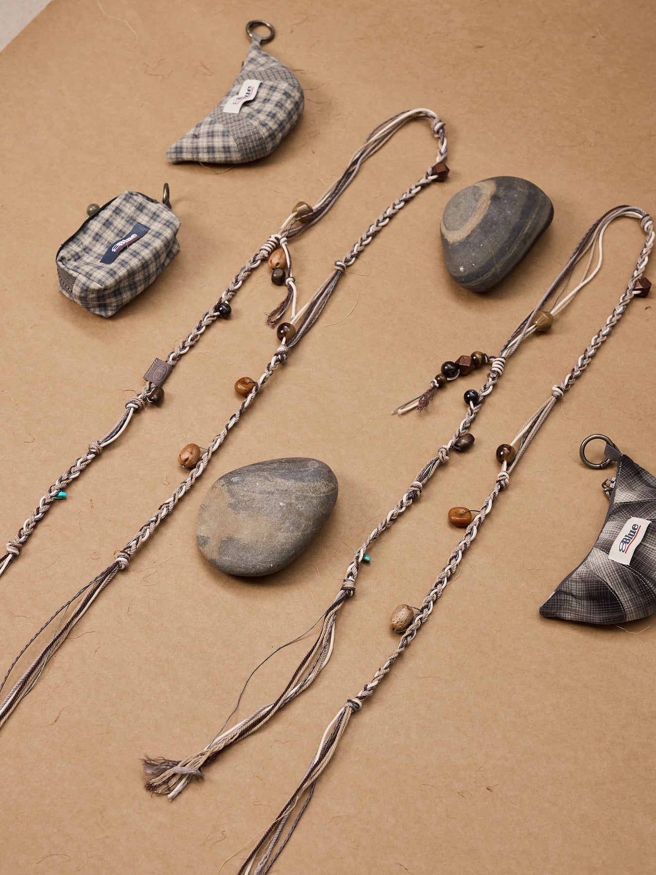 独特の編み込み技法で、質感のある牛骨ビーズ、八角形の木製ビーズ、五眼六通の種子ビーズ(南酸棗の果核を使用)を組み合わせています。