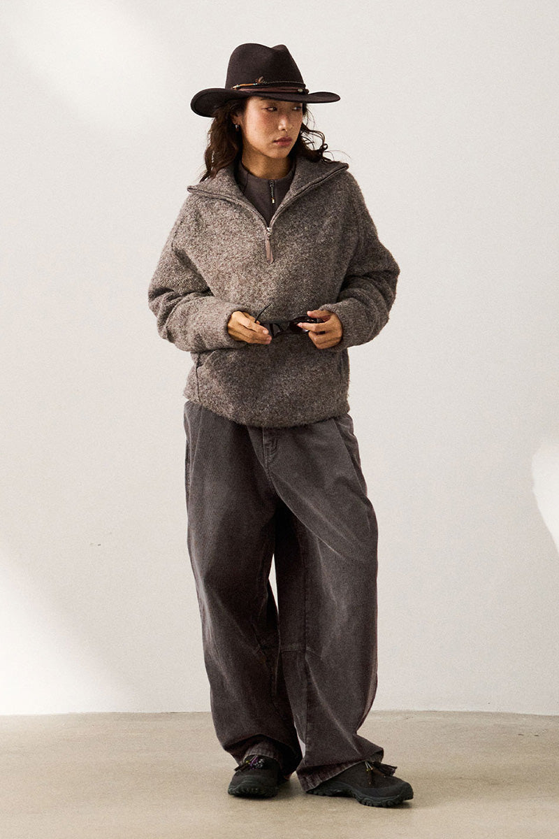 ゆったり微錐シルエット:上半身はすっきりとしたリラックスフィットで、下半身はややテーパードにした微錐ライン。脚線美を引き立て、どんな体型にも合わせやすい高い包容力を持ちます。