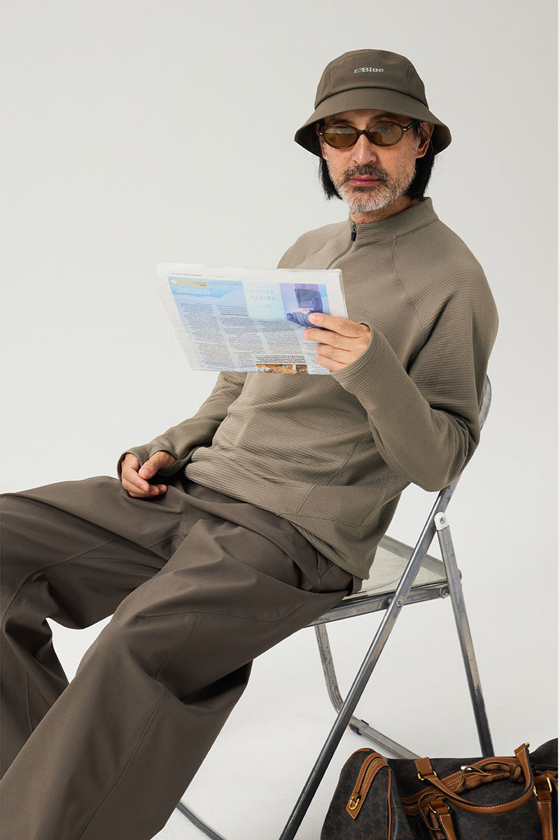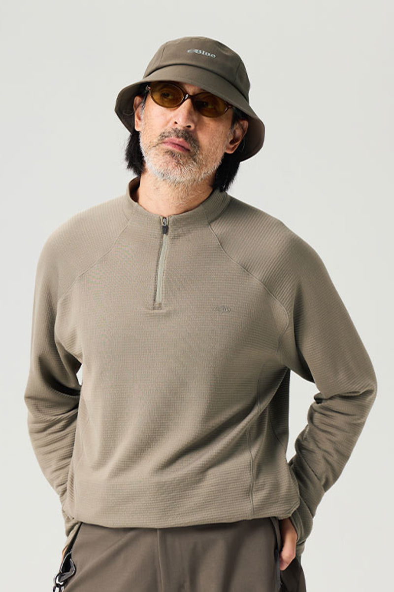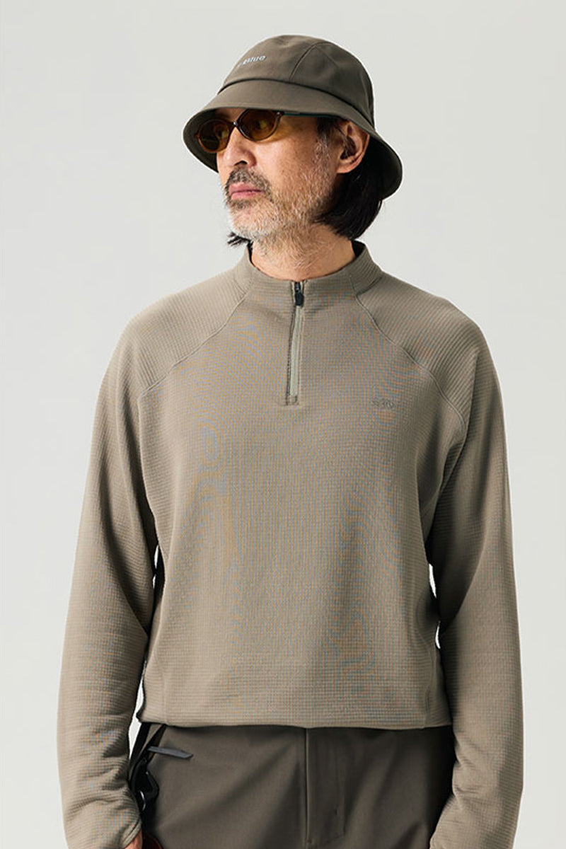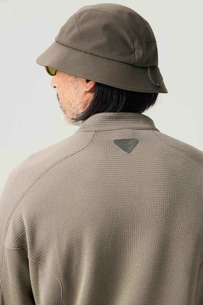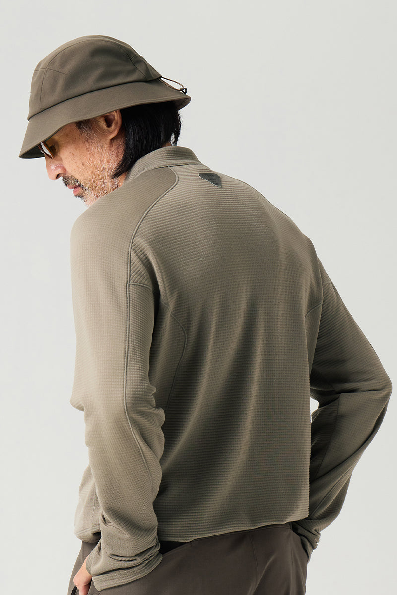 首元には半開きタイプのジップを配置しています。着脱が簡単で、風の侵入を防ぎながらも、通気性を確保できます。スタイリッシュなシルエットを演出しつつ、機能性も兼ね備えています。