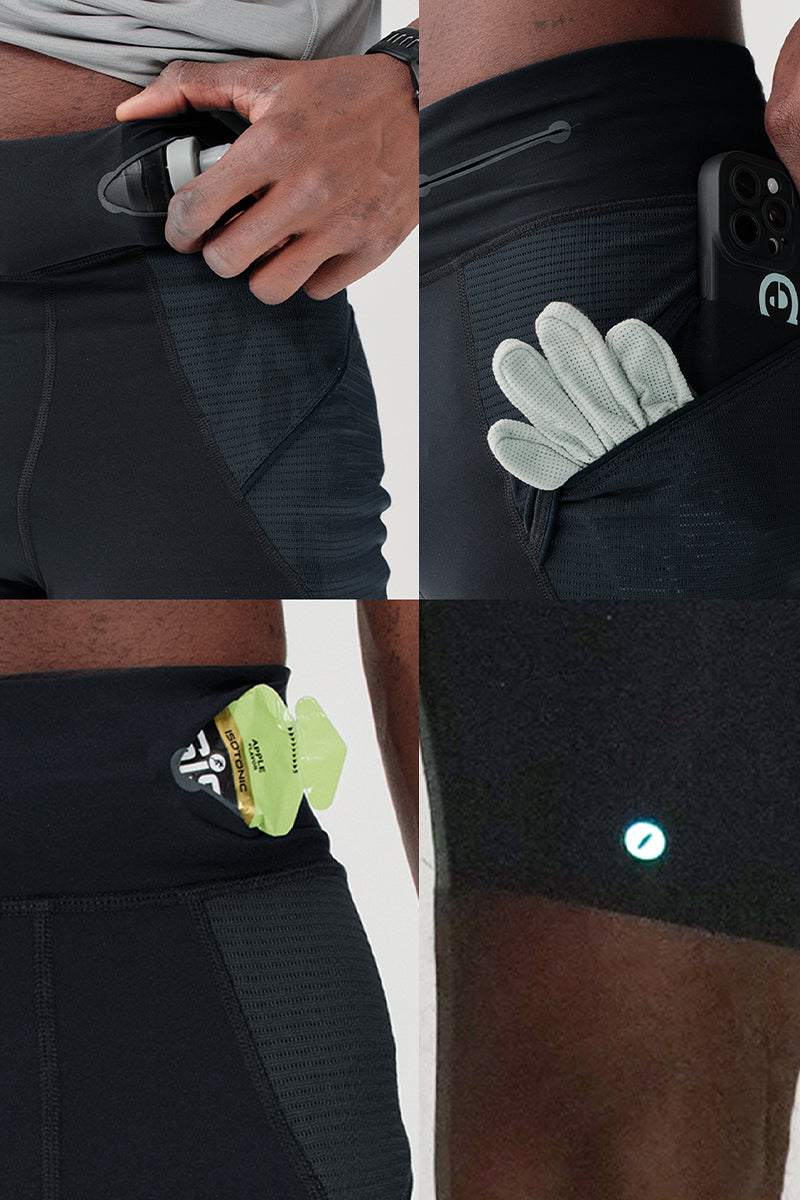 腰部にカエルの瞳カットアウト構造の収納ポケットを設け、三面貫通で安定した衝撃吸収を実現。メッシュ素材のサイドポケットで、小物の収納が便利。後腰には内蔵ジッパー付きポケットを配置。貼り合わせ構造により、小銭や証明書などを安全に保管可能。脚部にはスマホ専用のフィットポケットを設け、動き中にズレず安定して装着。足首部分には防滑点胶を内蔵し、運動中にズレにくく、快適なフィット感を維持。